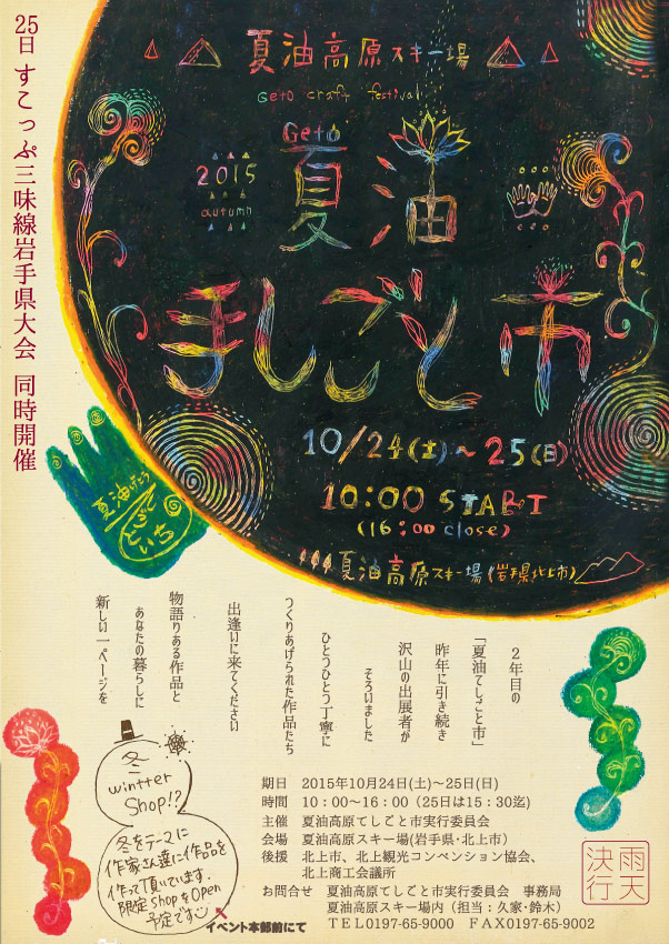 おかげさまで、第2回の夏油てしごと市出展者は予定数に達しまして、出展募集を終了しております。
