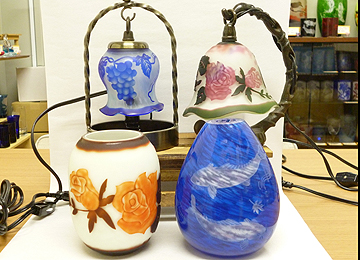 82- ガラスアートゆめ工房出店ジャンル:ガラス雑貨系 新潟市 サンドブラスト技法で江戸切子用のグラス、2層、3層、4層のスタンドランプ、花瓶にオンリーワンの彫刻をしています。 |