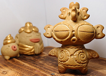 37 スタジオ土ぼっくり陶芸系 <盛岡市> 土系素材ですが一般の陶芸とは異なる「オーブン陶土」を主に使い作品制作しています。低温(165℃)で加熱硬化するために土の風合がよく出る特徴を活かし他には無いオリジナルの世界を作っています。その種類は40種ほど。ほかに縄文土偶イメージの作品やオリジナルデザインの仏像なども制作しています。どれも見るだけでなんだか楽しくなってしまう表情をしています。当日はお客様とともに楽しい空間を作りたいと思います。 ブログ:http://blog.goo.ne.jp/craft158 |