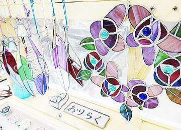 3 おりらくガラス細工系 <奥州市>ステンドグラスでブローチ、ペンダント、吊るし飾り、リースなど多種多様の物を作っております。 同じデザインでも硝子の種類で違った感じになります。オリジナリティを大切にして皆様に愛される作品作りを目標にしております。 硝子の輝きを楽しんで頂きたいと思います。