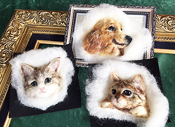 92 Felt egg裁縫系 <盛岡市>羊毛フェルトの技法で、アクセサリーや雑貨を作っています。何色もの羊毛をランダムに混ぜて作る事で、同じ物が無い、不思議な面白みのある作品に仕上げています。額絵は、羊毛を絵具がわりにして動物を描きました。少し立体的にし、リアル感をだしています。
