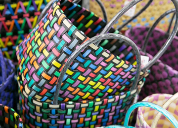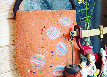 不要になった布を細かく裂いて織り機で経糸を通した織り機で一段一段ていねいに織り込みバックや小物入れ等を作っています。元の布の色の組み合わせによって変化する裂織を使用しての製品のため、すべてが、一点ものです。 |