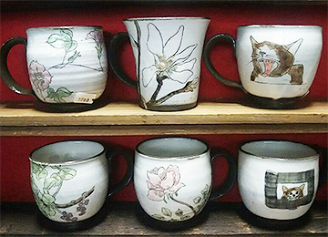 絵のある食器を中心に焼き物を作っています。花、動物、人物が多いです。使っていて楽しくなるように作る時も難しい顔にならないように穏やかな表情でしています。ぜひ来場して他の人のと比較をしながら手に取ってみてください。 |