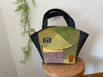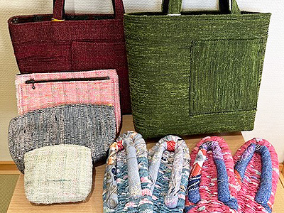 不要になった布を細かく裂き 織り機で一段一段丁寧に織り込みバッグやポーチなどを作っています。 元の布の組み合わせによって変化する裂き織を使用しているのですべての製品が一点物です。 また 裂いた布で作る布草履は素足に気持ちよく馴染み快適です。