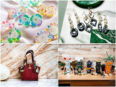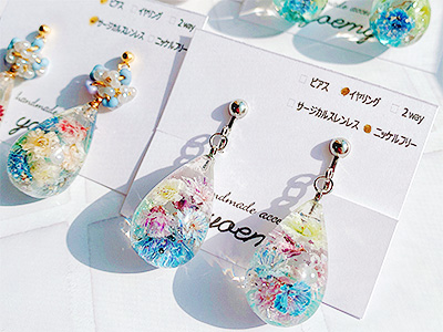 日本の手漉き和紙や天然石、ドライフラワーなど自然素材を封入したレジンアクセサリーを中心に作っております。 自然素材ならではのぬくもりがあります。 また、今回限りの限定品もございますので、是非手に取って一期一会の出会いをしていただければ幸いです。 |