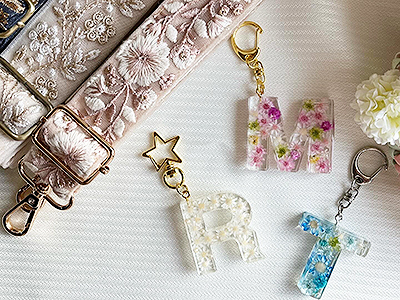 透明感あるレジンの中にドライフラワーやパーツを封入したイニシャルキーホルダーを作っています。 お花本来の色味を楽しんで下さい。 また、繊細で可愛い刺繍のインド刺繍リボンで作った雑貨も多数準備しておりますので、ぜひご覧ください。 |