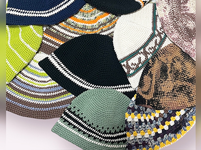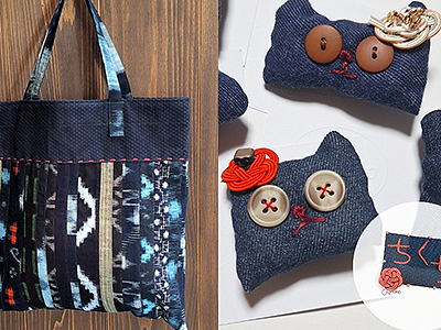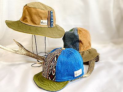 帆布やリメイクデニムから作った帽子、リメイク生地を使用して作った洋服など。