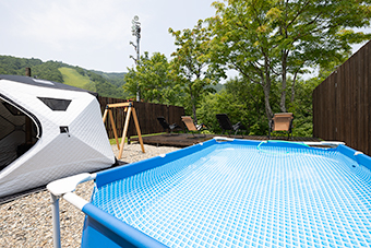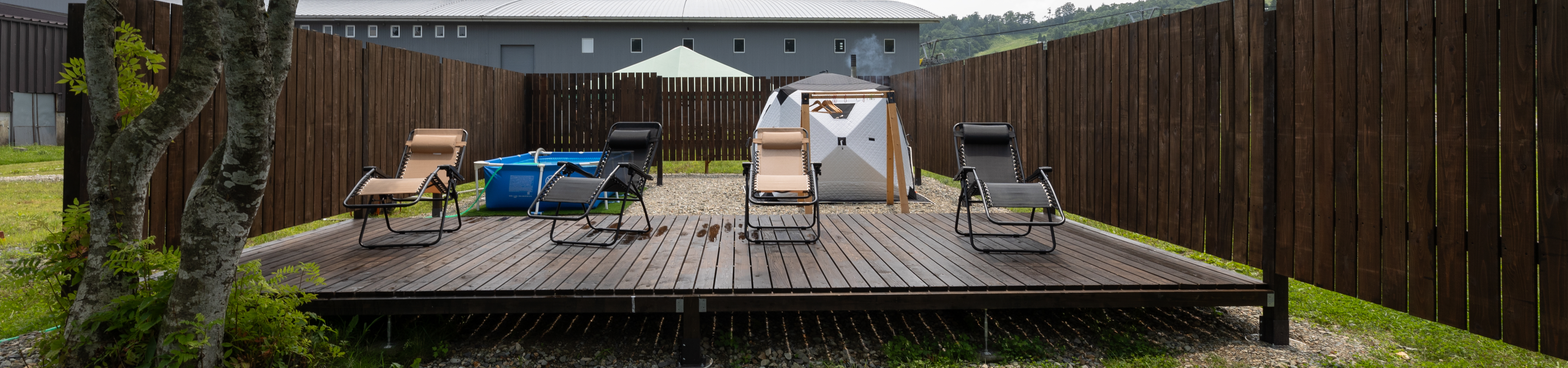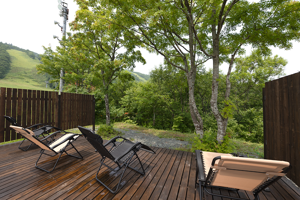 メインディッシュの外気浴はインフィニティチェアで!夏油の自然と融合して素晴らしいととのいの世界へ。