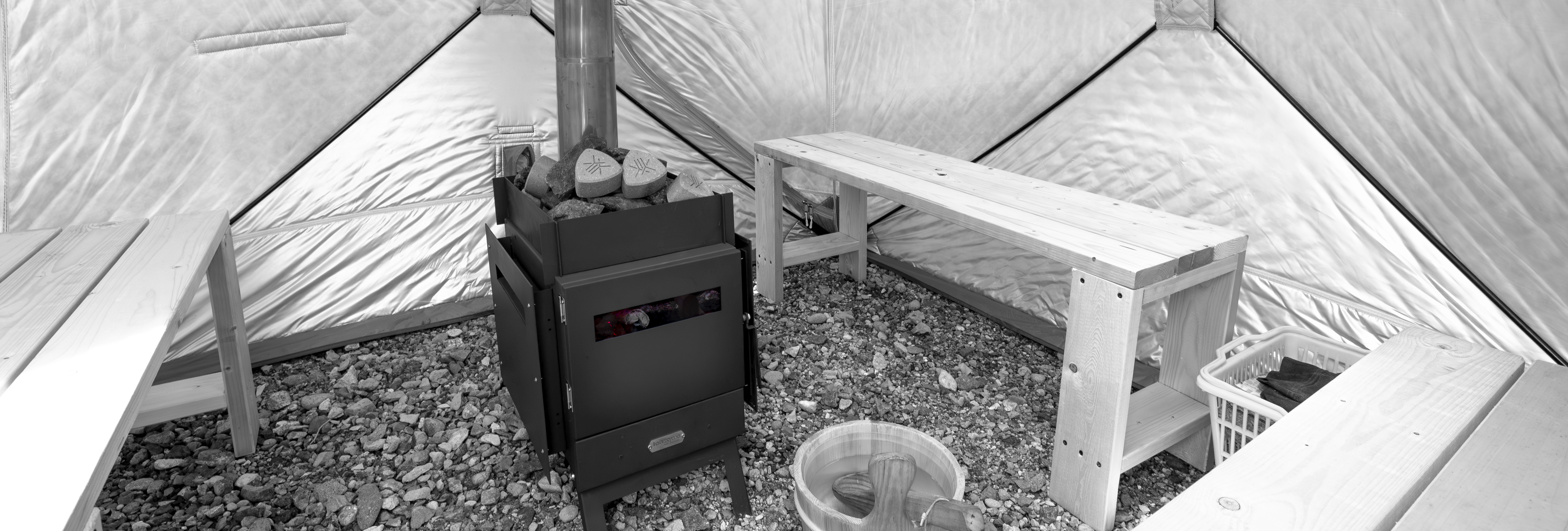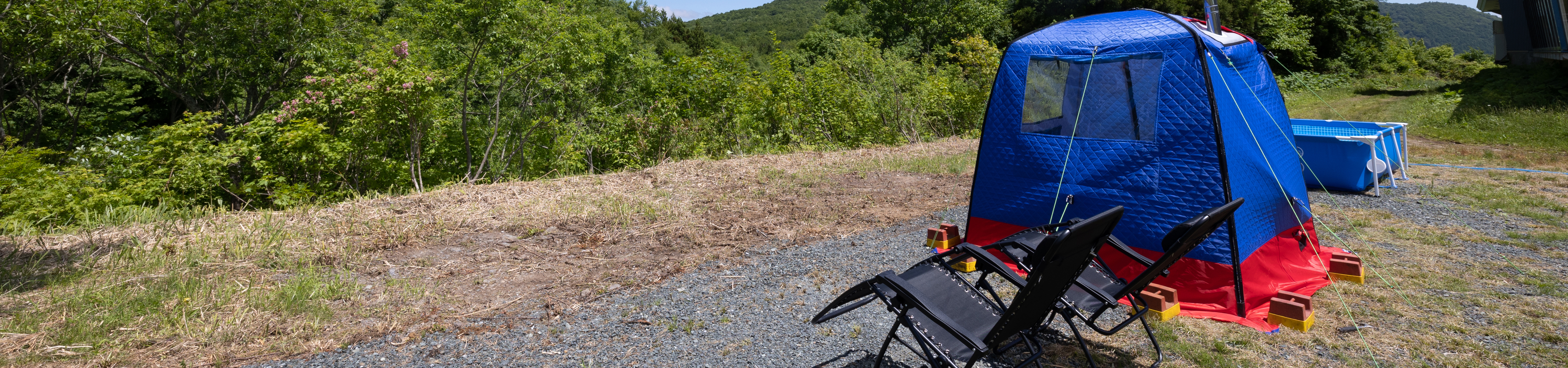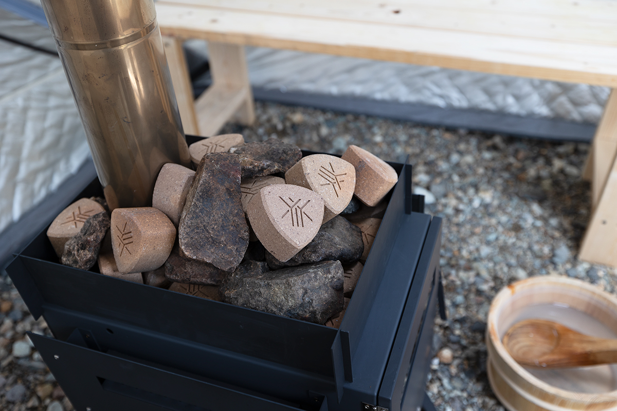 テントサウナは、日本国内ブランドである「I sm Sauna」 ストーブは、国産の高火力、二次燃焼高効率薪ストーブ「tanzawa2」を使用。アロマ水でロウリュを楽しんで身体を芯から暖めて、水風呂でクールダウン。