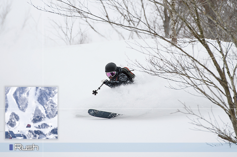 ’ビーチ’はブナの英名。ここはブナの大木が適度な間隔で並び、快適なスピードでツリーランできるエリアです。 スタートはスティープな尾根がいくつか並び、起伏を使って様々なトリックも可能。中盤は徐々に斜度が緩くなりますが、木の間隔も広く、スムーズに抜けられます。 後半はエリアを外れないように標識を注視しながら出口へと進み、尾根の起伏を乗り越えることになります。 最後はトラバース気味で進むので、新雪時は苦労することも。 単独ではなく複数人でエントリーすることをお勧めします。 また、標識を見失うと危険です。最初のうちは、適度に停止し、自分の位置を把握しながら進んでください。