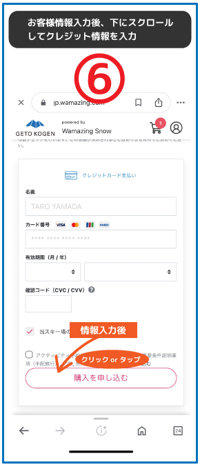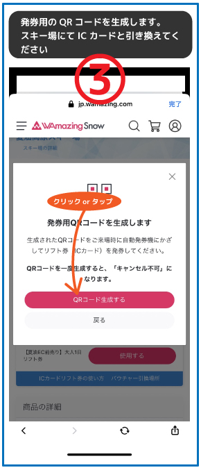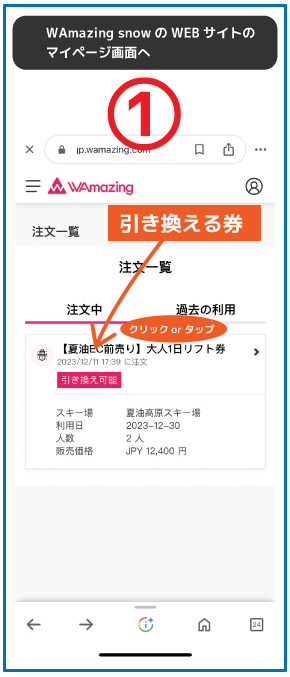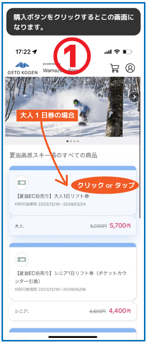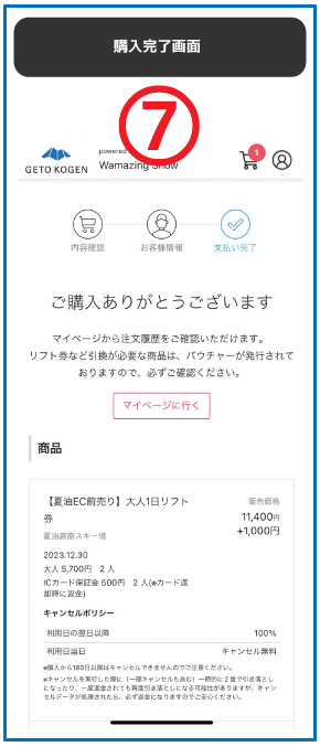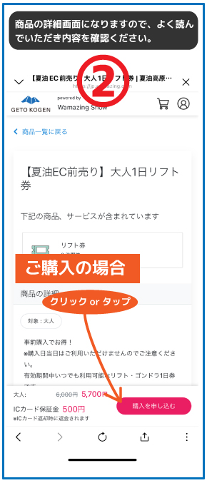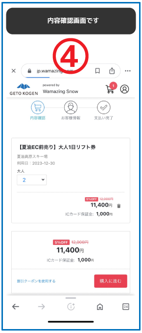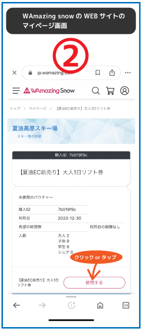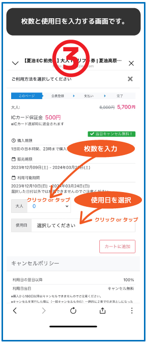 ② 来場日を選択ください。利用日前日23時まで購入可能です。